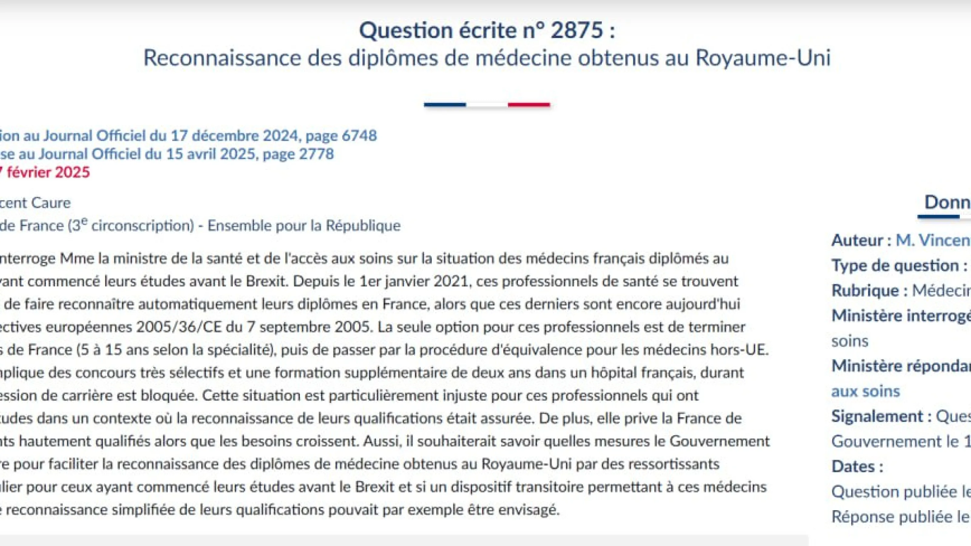 Réponse du ministre à ma question sur la reconnaissance des diplômes de médecine obtenus au Royaume-Uni
