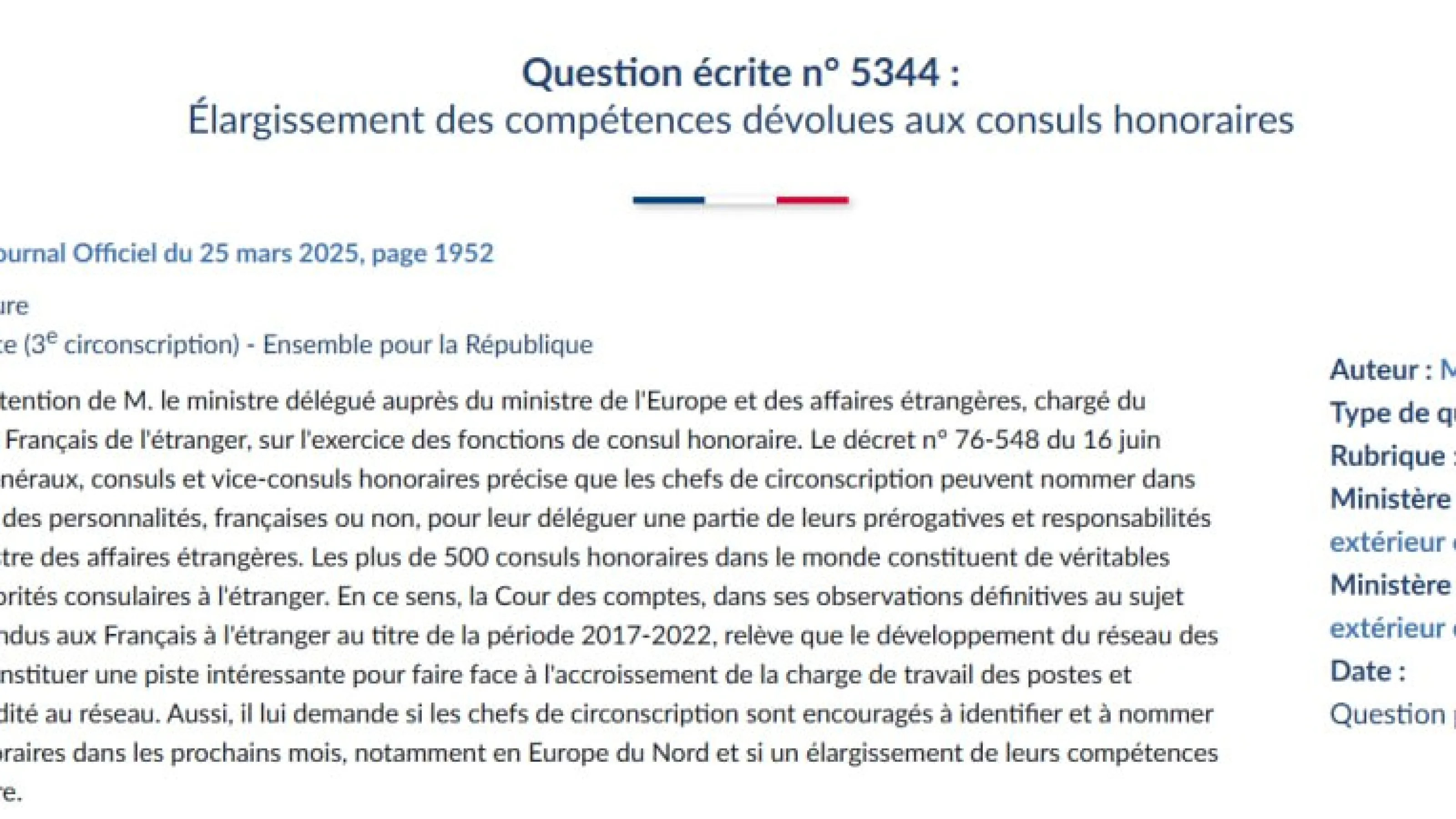 Question écrite n° 5344 : Élargissement des compétences dévolues aux consuls honoraires